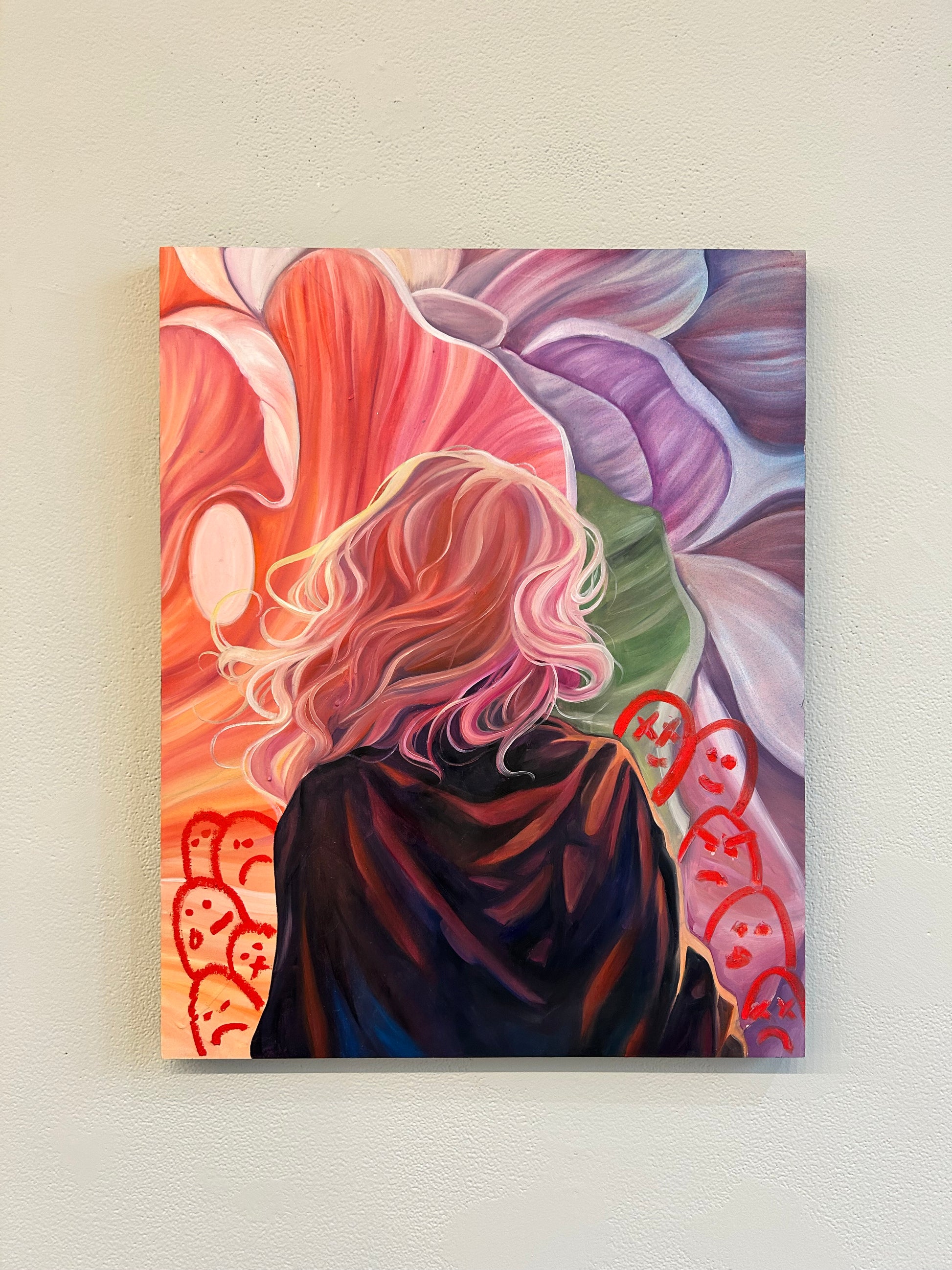 Oil, oil pastels and spray paint on wood board 16x20