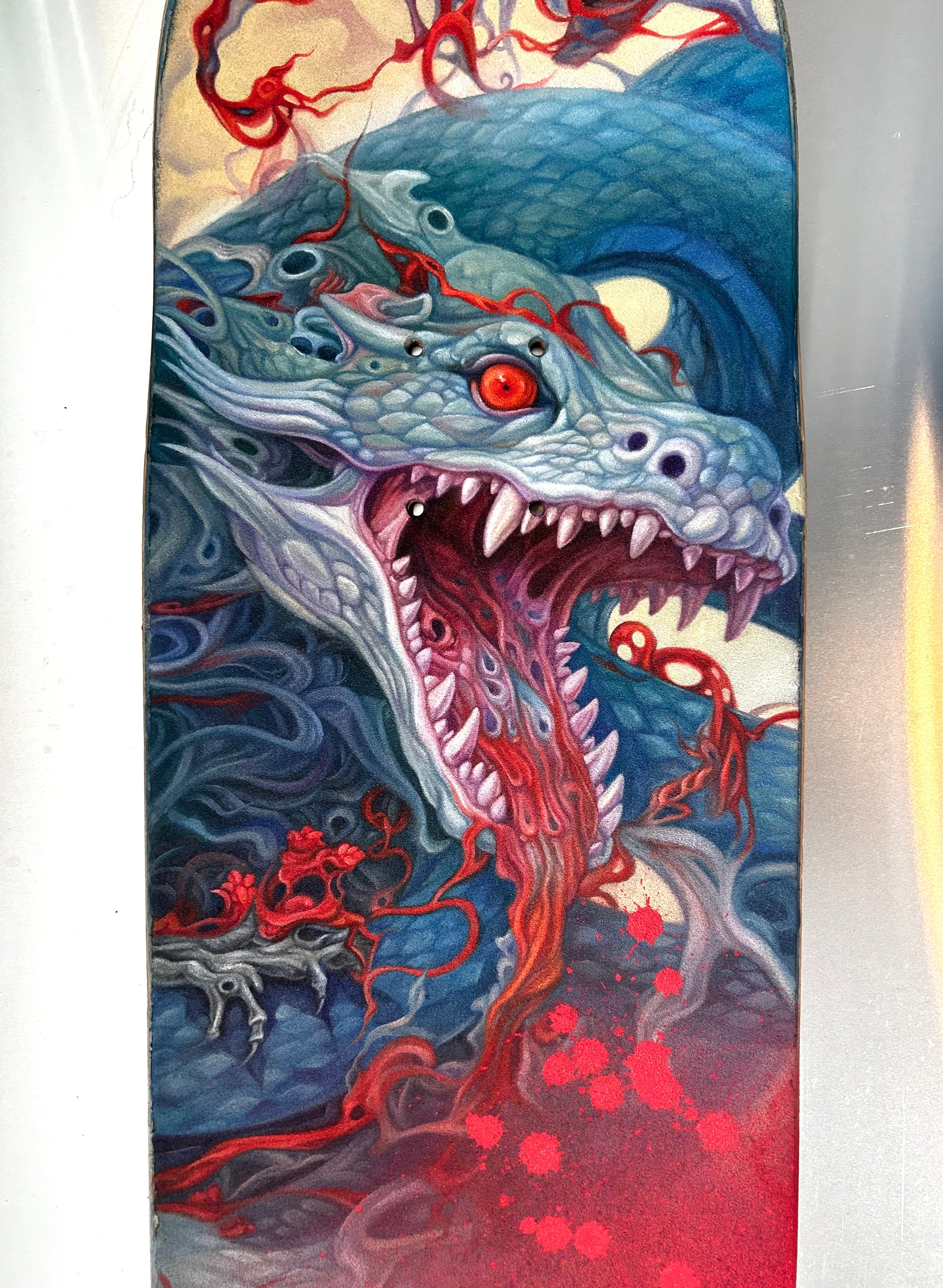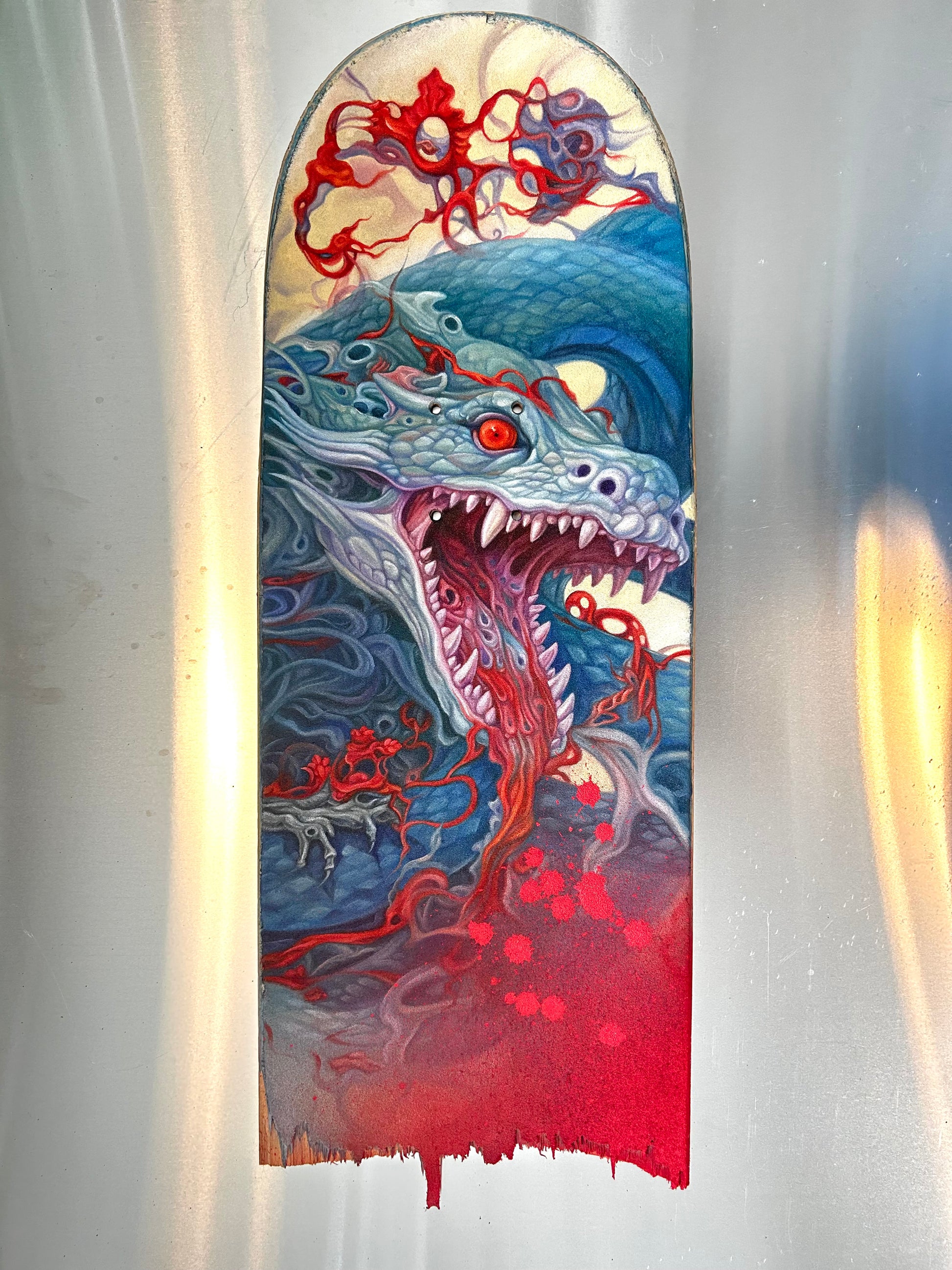 Oil Painting on a broken skateboard. Created for the "Decked Out" group exhibition with All Star Press Chicago. The skateboard was given to me by the amazing skater Julian Lewis, where we artfully broke it in half.