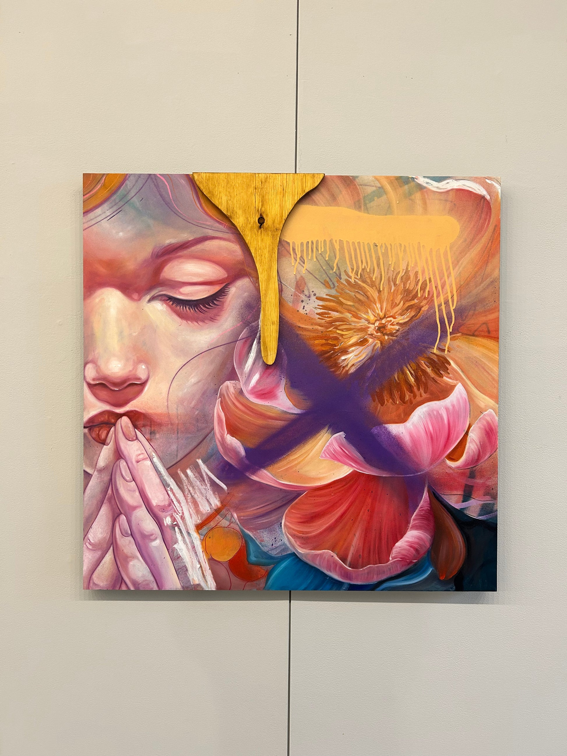 Oil, spray paint, cut wood, colored pencil, and oil pastel on wood board